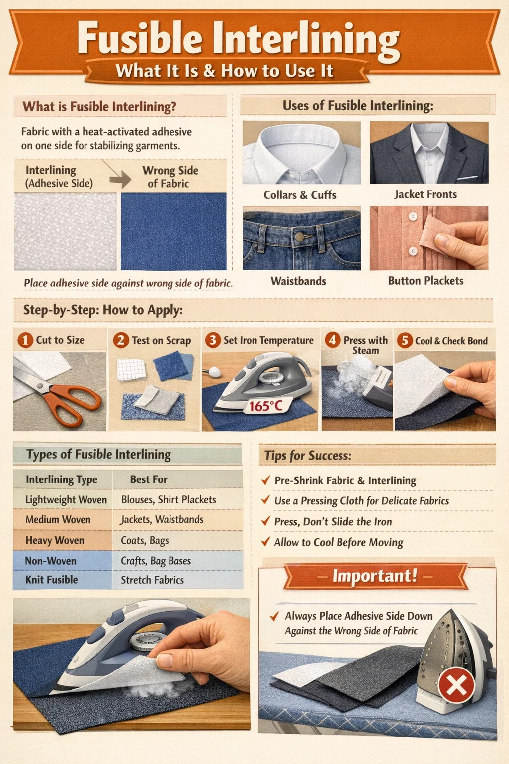 | Interlining Type | Best For | Fabric Match | Iron Temp |