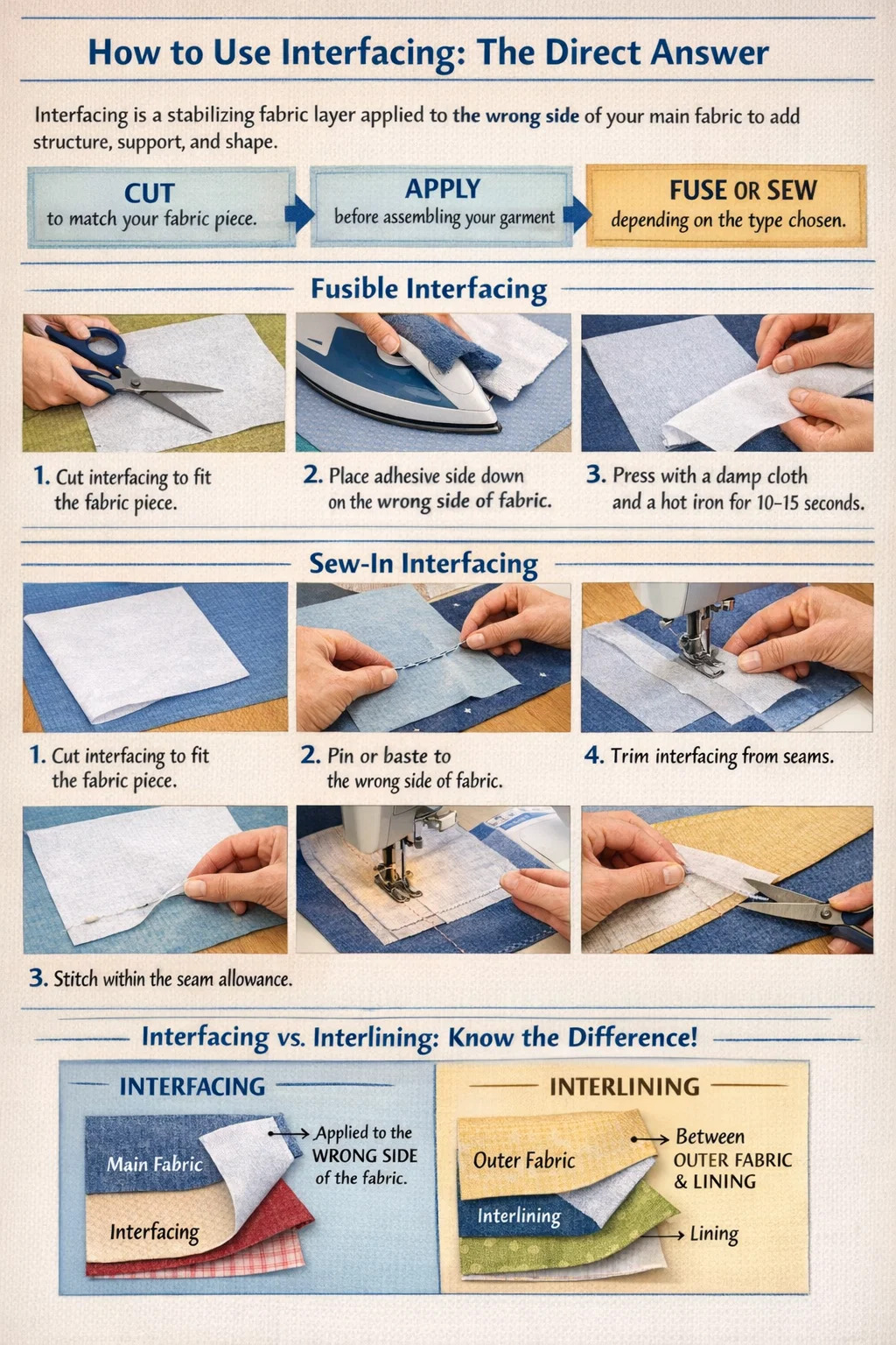Before diving into application techniques, it is worth getting the terminology straight, because confusion between interfacing and interlining leads to incorrect fabric choices and disappointing results.