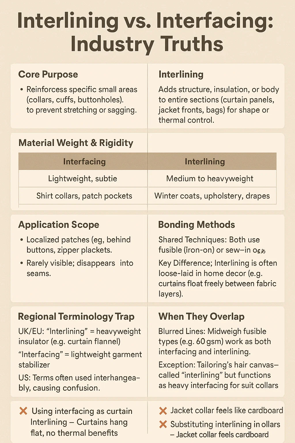 US: Terms often used interchangeably, causing confusion. Pro tip: Check context—"curtain interlining" always means insulation layer.