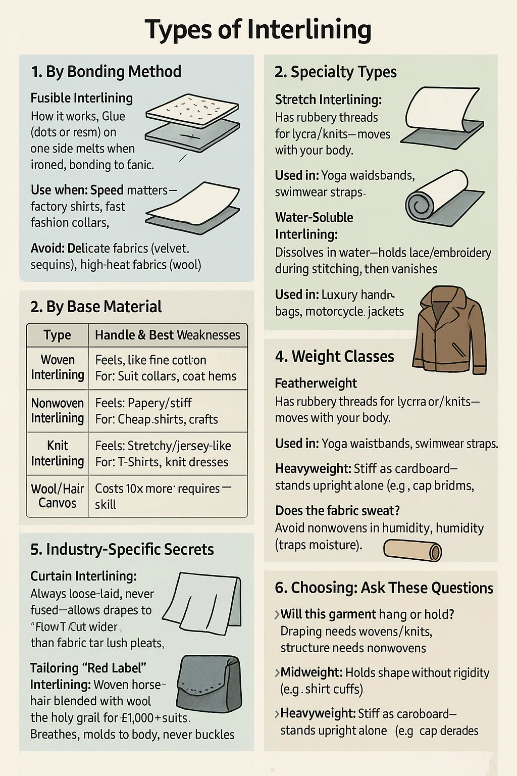| Nonwoven Interlining | • Feels: Papery/stiff• For: Cheap shirts, crafts | Tears when wet; cardboard drape |