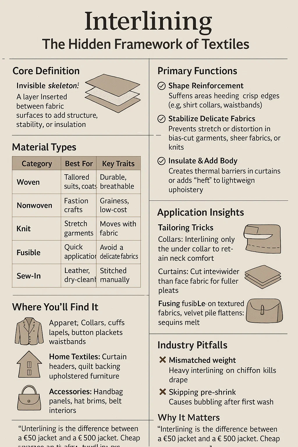 "Interlining is the difference between a €50 jacket and a €500 jacket. Cheap versions crack after dry cleaning; luxury types outlive the outer fabric." — Bespoke Tailor, Milan