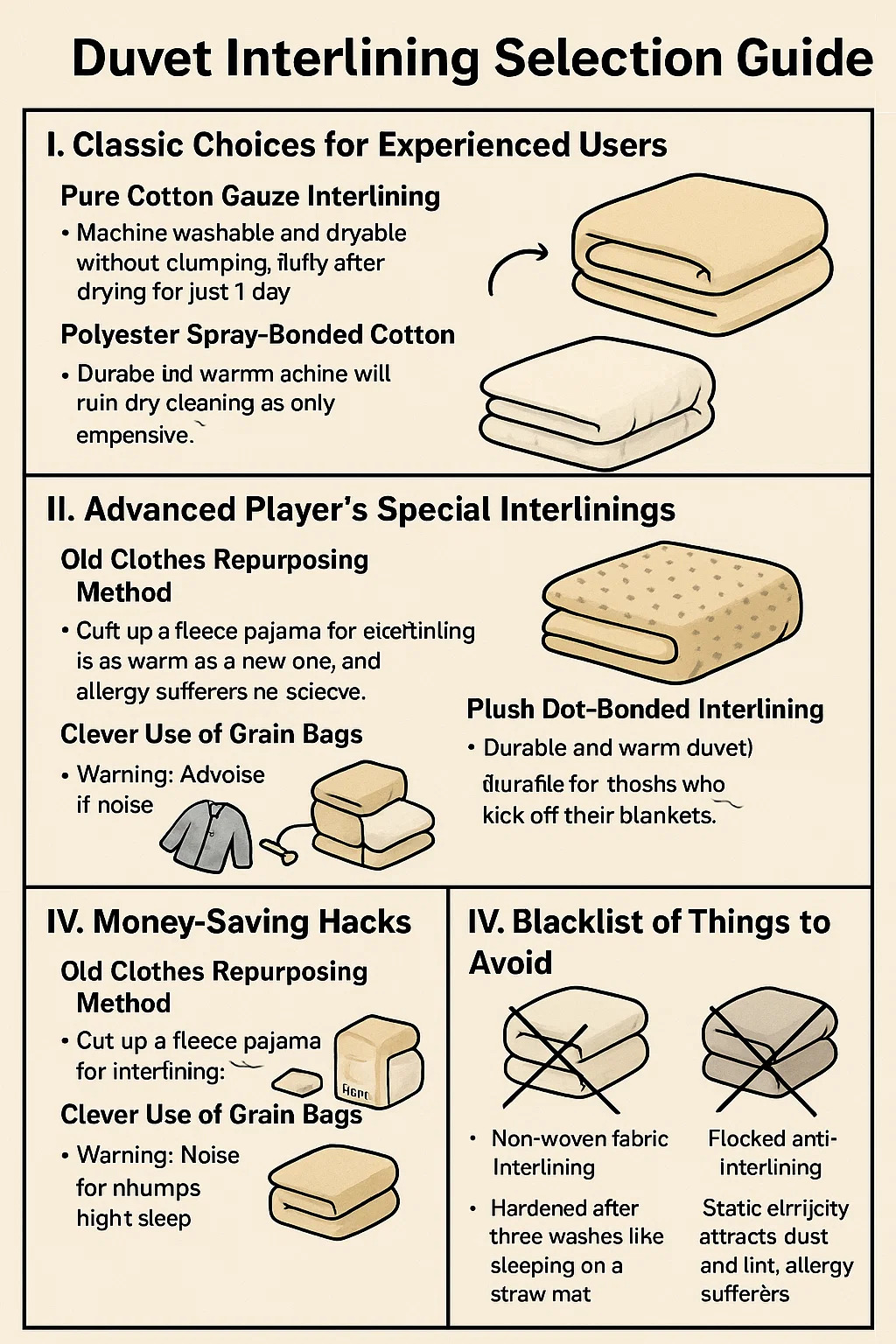 Flatten the inner Interlining of a rice bag and use it as a duvet filling liner; it prevents the filling from shifting and blocks moisture, a lifesaver during humid weather in the south.