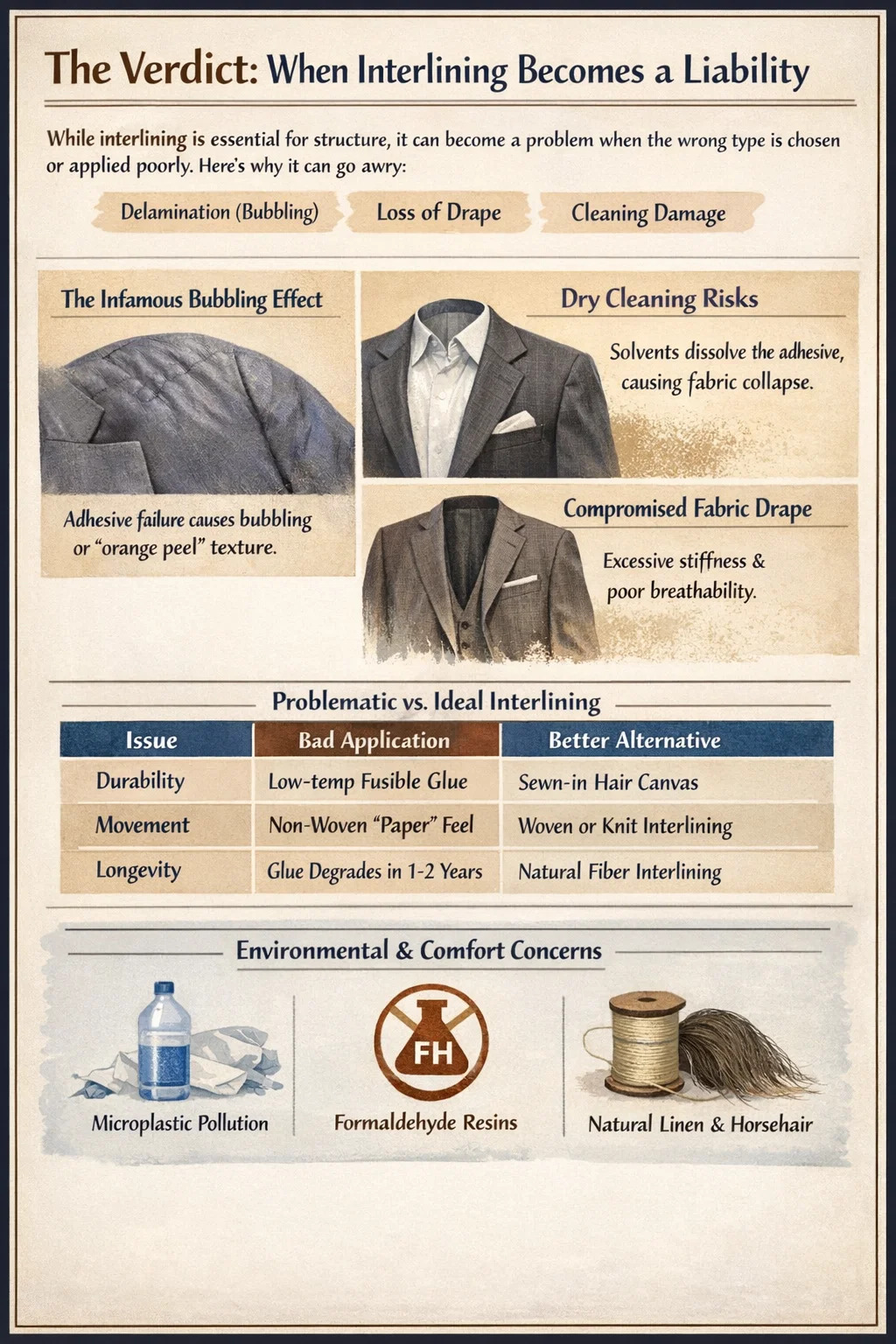 Modern fast fashion relies heavily on synthetic interlining, which introduces a high microplastic footprint. Because these layers are bonded with resins and glues, they make the garment nearly impossible to recycle. Furthermore, cheap interlining often uses formaldehyde-based resins during the manufacturing process, which can cause skin irritation for those with chemical sensitivities. To avoid these "bad" outcomes, many high-end tailors have returned to natural linen or horsehair layers that provide structure without the chemical downsides.